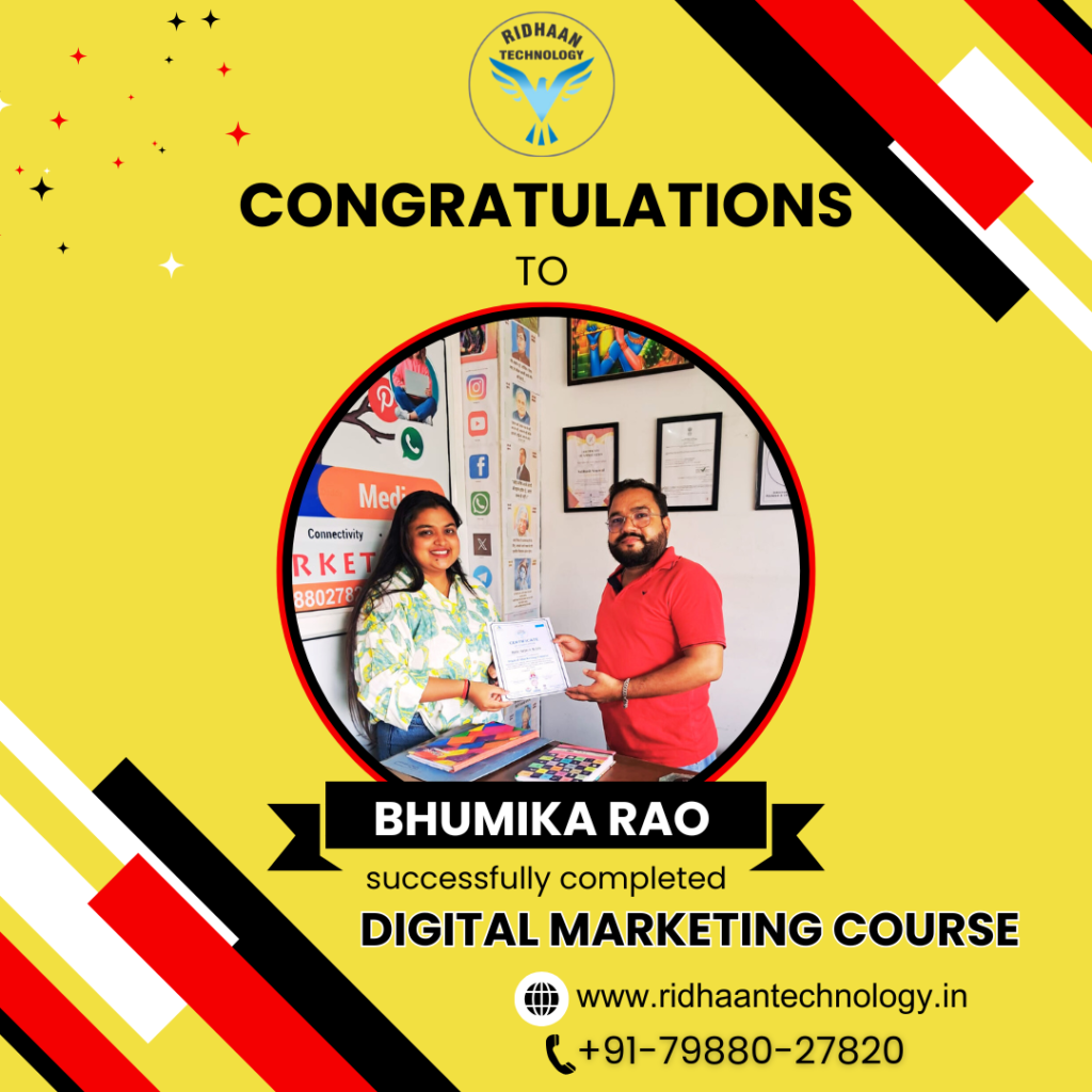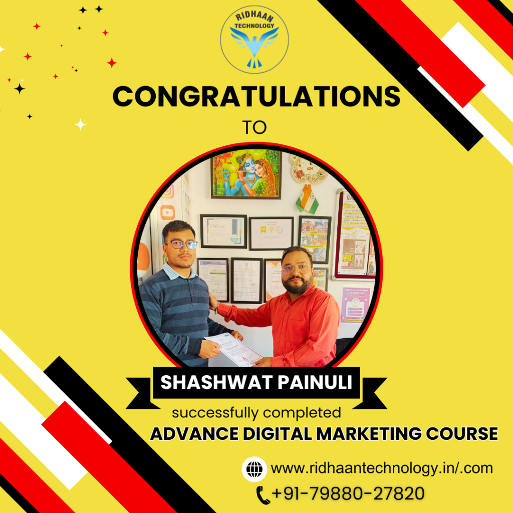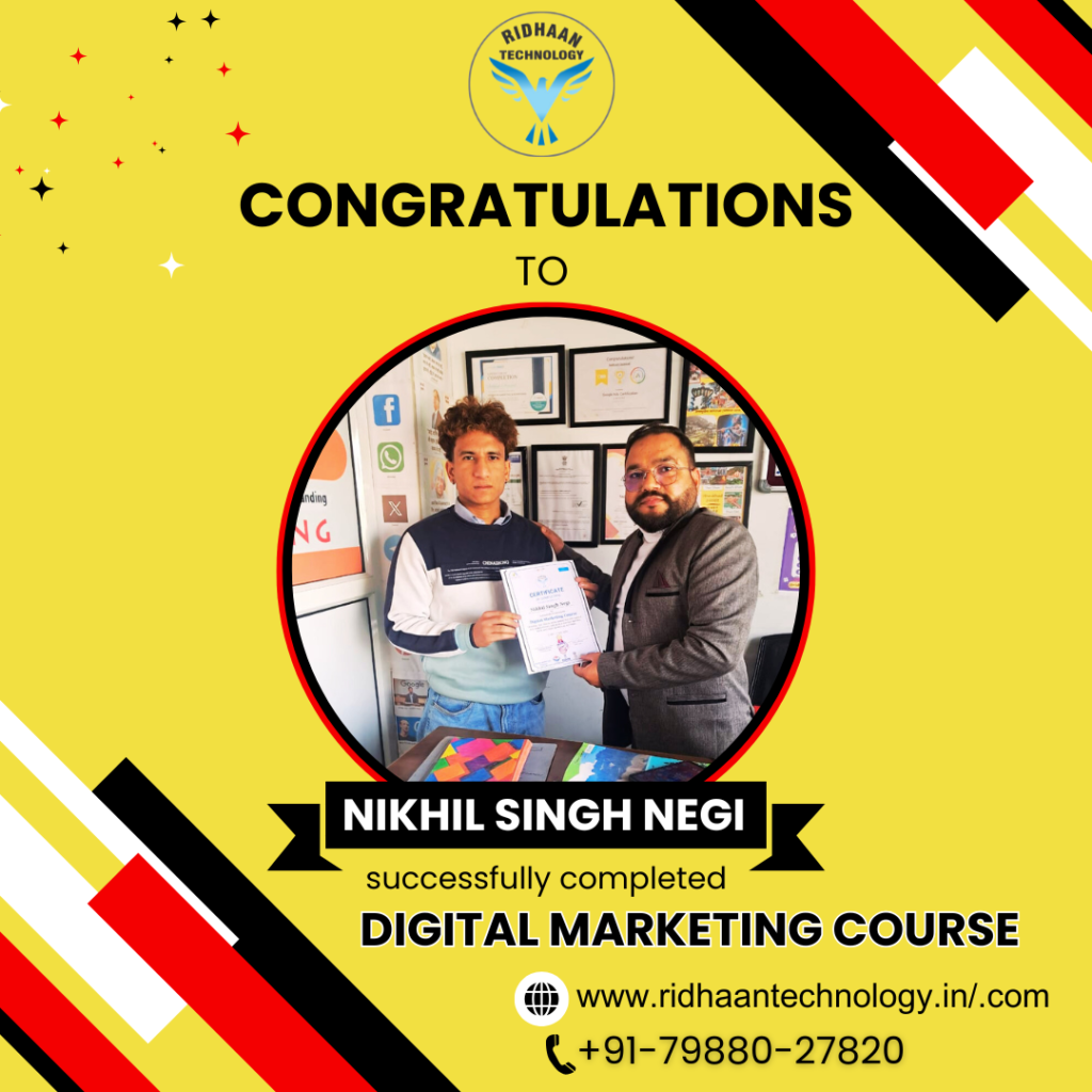 In the dynamic realm of digital marketing, overcoming challenges is key to realizing dreams. At Ridhaan Technology, we empower career aspirants to build successful futures in digital marketing. With years of industry experience, we offer basic to advanced Digital Marketing certificate course that provides practical, hands-on training to equip you with in-demand skills. Join us to master strategies and tools essential for a thriving career in digital marketing. 50% off FEE discount for 1st Five enrollments and Pahadi students. Hurry Up!